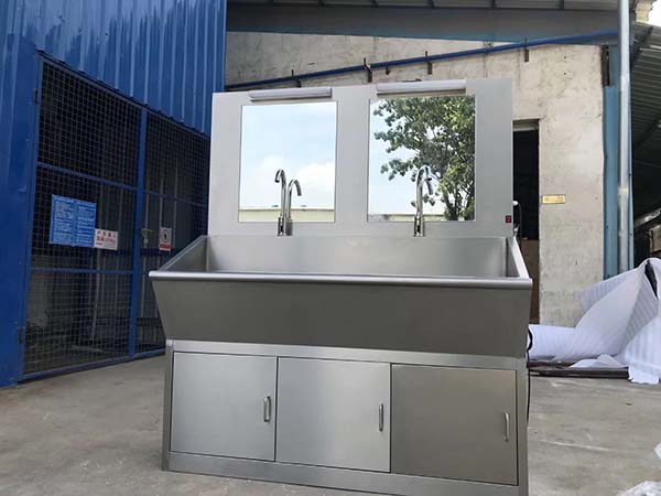 醫(yī)用洗手池說明:不銹鋼醫(yī)用洗手池:采用進(jìn)口優(yōu)質(zhì)304不銹鋼板制造,國際標(biāo)準(zhǔn),靜音防濺,園弧結(jié)構(gòu),恒溫出水,配備鏡燈和感應(yīng)皂液器,標(biāo)準(zhǔn)型號為1人、2人、3人洗手池,可定制非標(biāo)各類洗手池。說明:不銹鋼材厚度為1.2mm或者1.5mm,自帶50L電熱水器,可自由設(shè)定出水溫度,出水分膝碰和感應(yīng)兩種方式,每個洗手位帶獨(dú)立鏡燈和鏡子,洗手槽采用特制的坡度設(shè)計,可有效防止水濺到洗手池外,各水嘴獨(dú)立設(shè)置,不影響其它水嘴的使用,方便使用及維護(hù)。